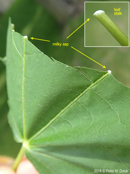 Norway Maple (Acer platanoides) was introduced to America as an ornamental plant. Norway Maple is are prolific seed producer, and as individual seeds escape cultivation, the species now threatens forests and forest edges. Norway Maple releases a unique milky white sap when the leaf stalk is broken